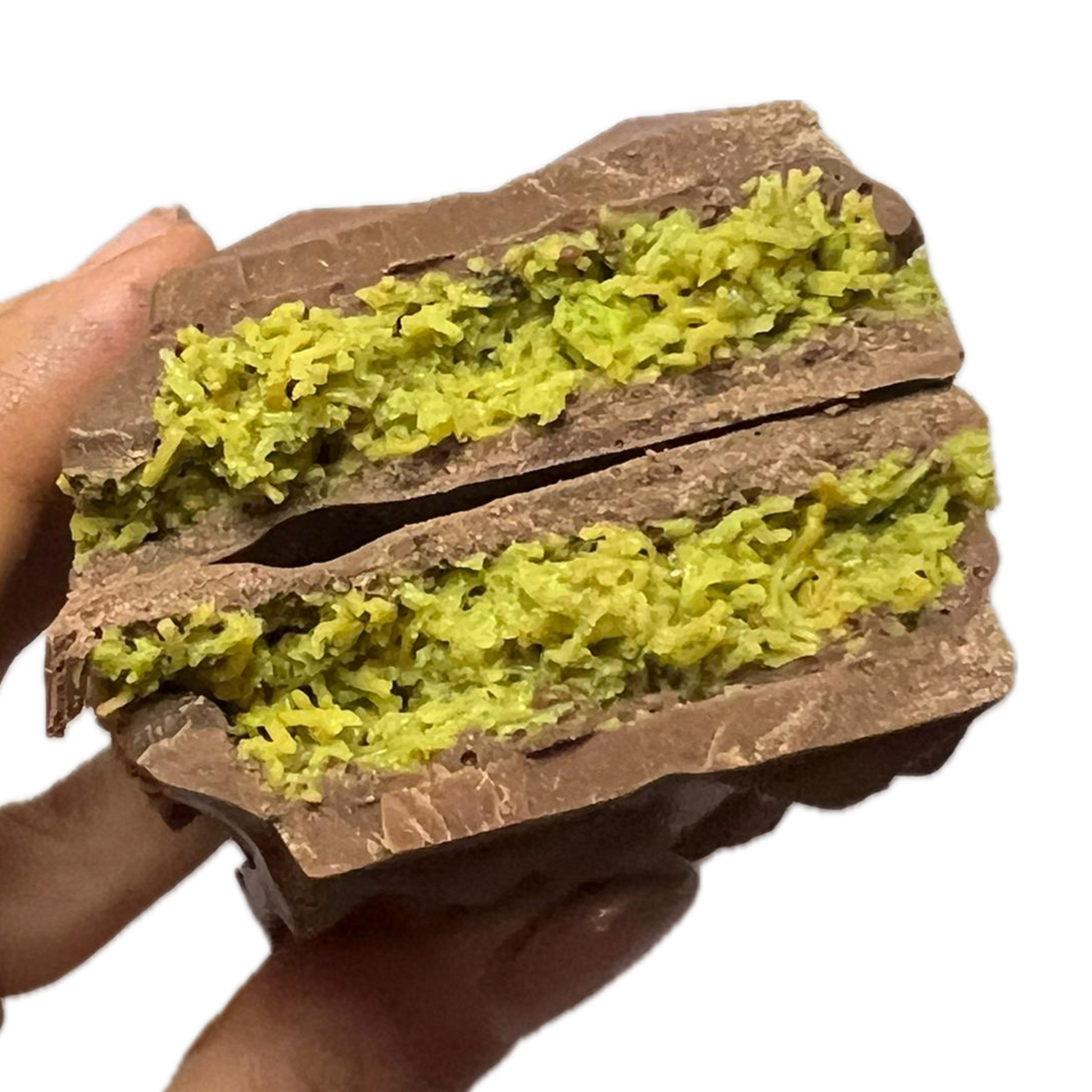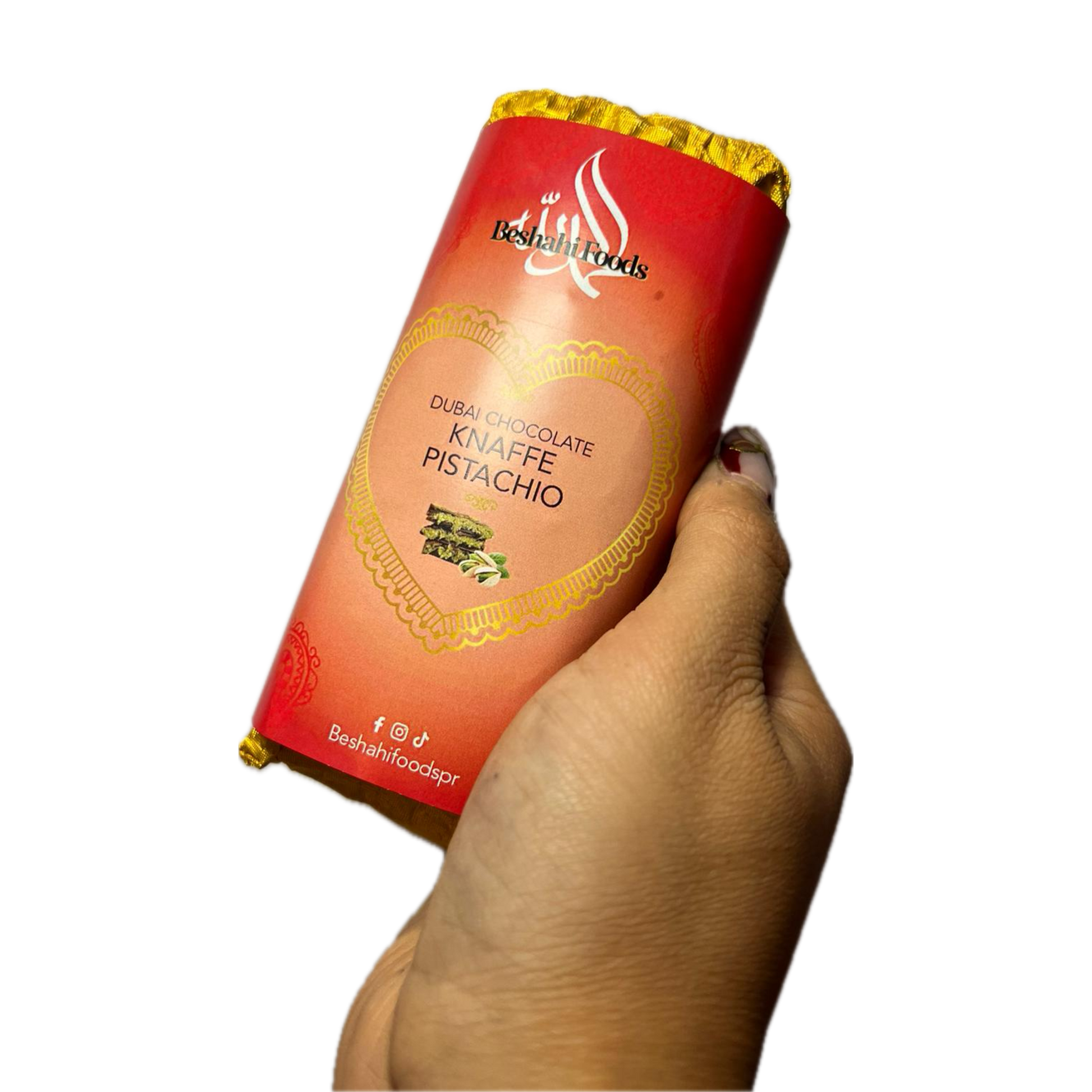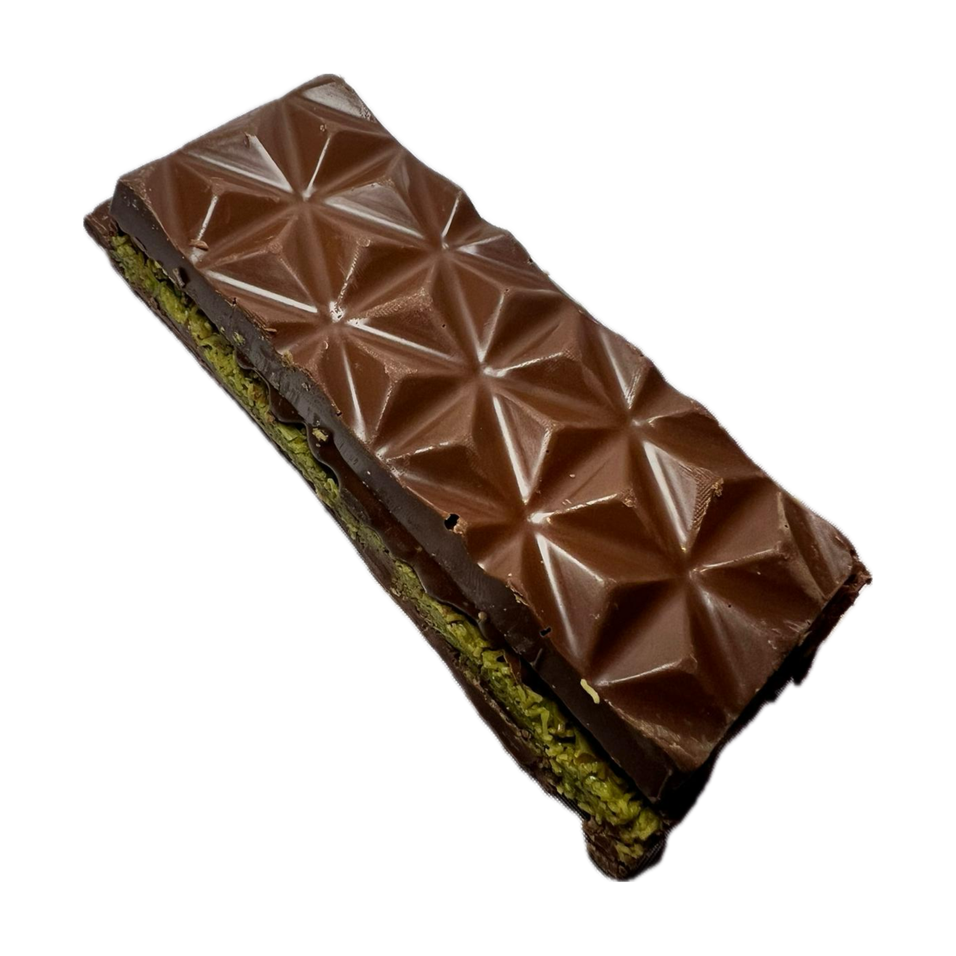 More than just Chocolate bar it is a desert! Enjoy our handcrafted chocolate filled with an Arabic pastry called Knaffe from the Middle East and freshly made pistachio cream, each bite will bring you a balance of salty from the Knaffeh and sweet taste of the Pistacho cream that will leave you craving more! Bar size 6 inches x 2 inches 10oz.